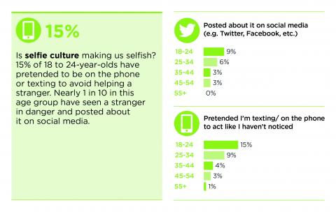 Some 15% of 18 to 24-year-olds have pretended to be on the phone or texting to avoid helping a stranger who was in danger.