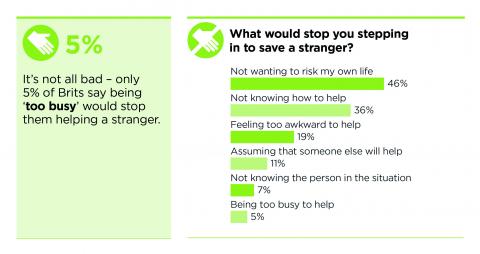 When asked what would prevent them from stepping in to help a stranger in danger, 46% of Brits said they would be concerned about risking their own safety, while 36% said they would not know how to help.