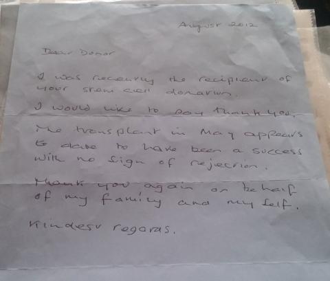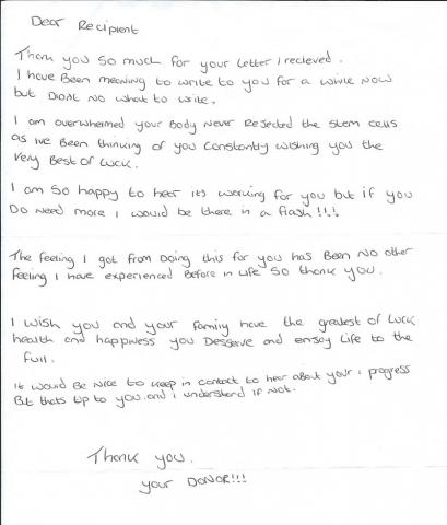Once he was well enough, he sent an anonymous letter to his donor which read: “Dear Donor, I was recently the recipient of your stem cell donation. I would like to say thank you.