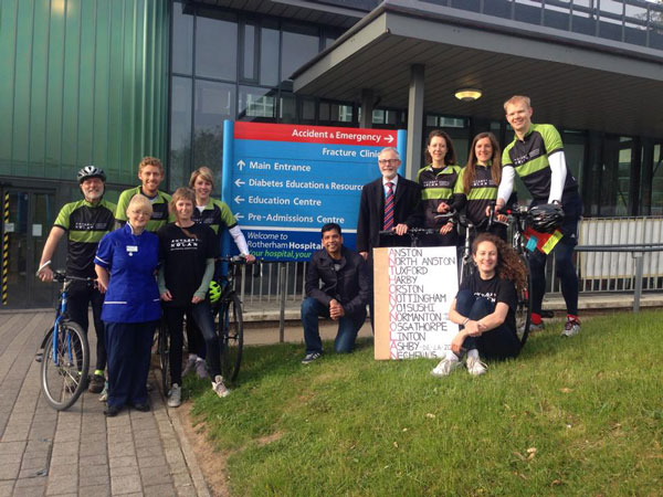 Alex with her friends at the the start of their cylcing challenge at Rotherham hospital, joined by her team: Dr Peter Taylor, Dr Arun-Alfred and Nurse Tracy Maher