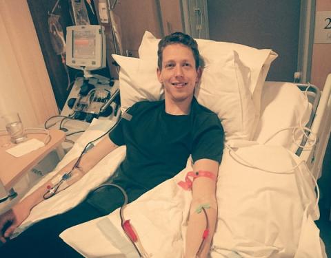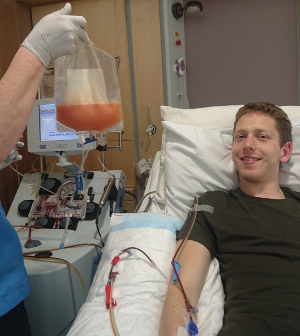On the day of my stem cell donation I was hooked up to a large machine for around 4 hours which took blood out of my left arm, removed the extra stem cells and put my blood back into my right arm. During the procedure, I was awake and chatting and busy on my phone and laptop. Following the procedure my aches had totally gone; I was tired but pain free and happy.
