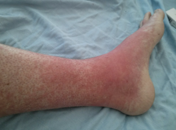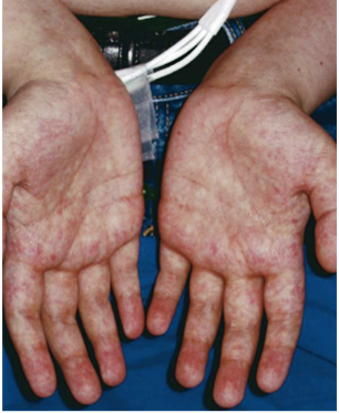 In terms of acute GvHD, the most common thing that we see is a red skin rash that looks a little bit like sunburn. Classically, it starts on the palms and soles of the feet, but really, it can happen anywhere on the body. It can be itchy and it’s sometimes painful.