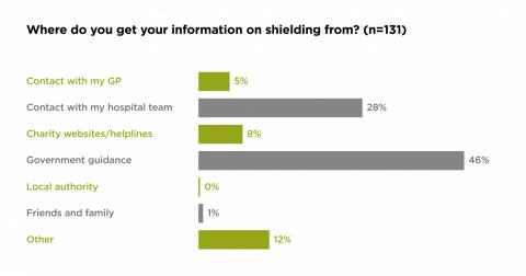 Government guidance is forming the basis of 46% of respondents’ knowledge of shielding, followed by contact with their hospital team (28%). This is despite 71% of this shielded cohort being able to contact their healthcare team as usual. Therefore, the clarity of national guidance is important as it is a key source of information for clinically vulnerable patients.