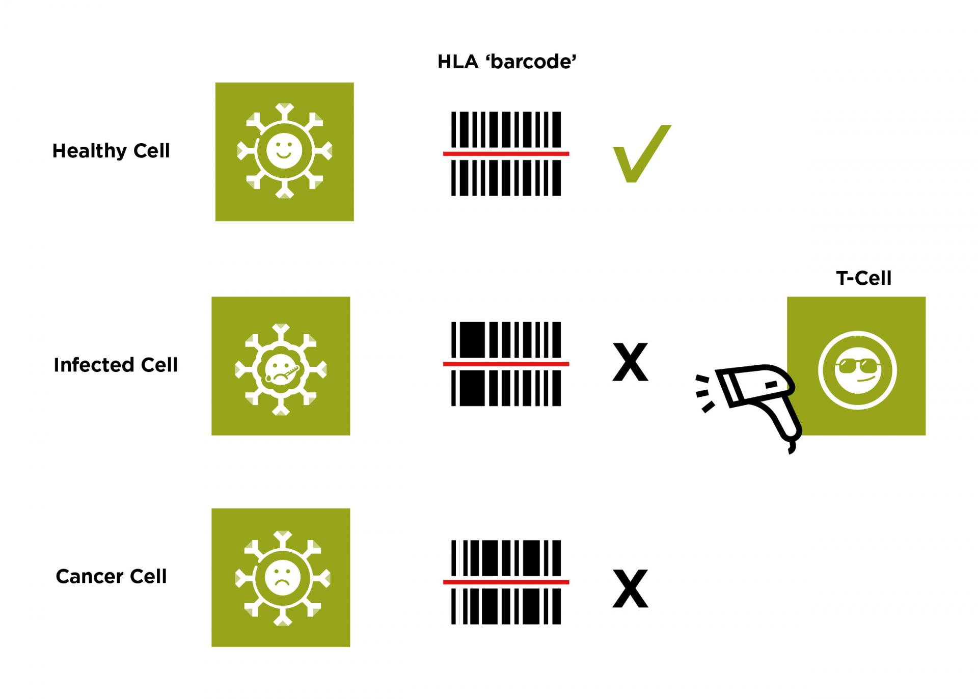 The proteins made by our HLA genes help create a barcode of the proteins found within our cells. They display this barcode on the outside of each cell so they can be inspected by cells of the immune system. White blood cells, such as T-cells, can scan this barcode and use it to decide if the cell is healthy and normal. If the T-cell detects an abnormal signal, which suggests the cell could be cancerous or has become infected, it will target the cell for destruction.