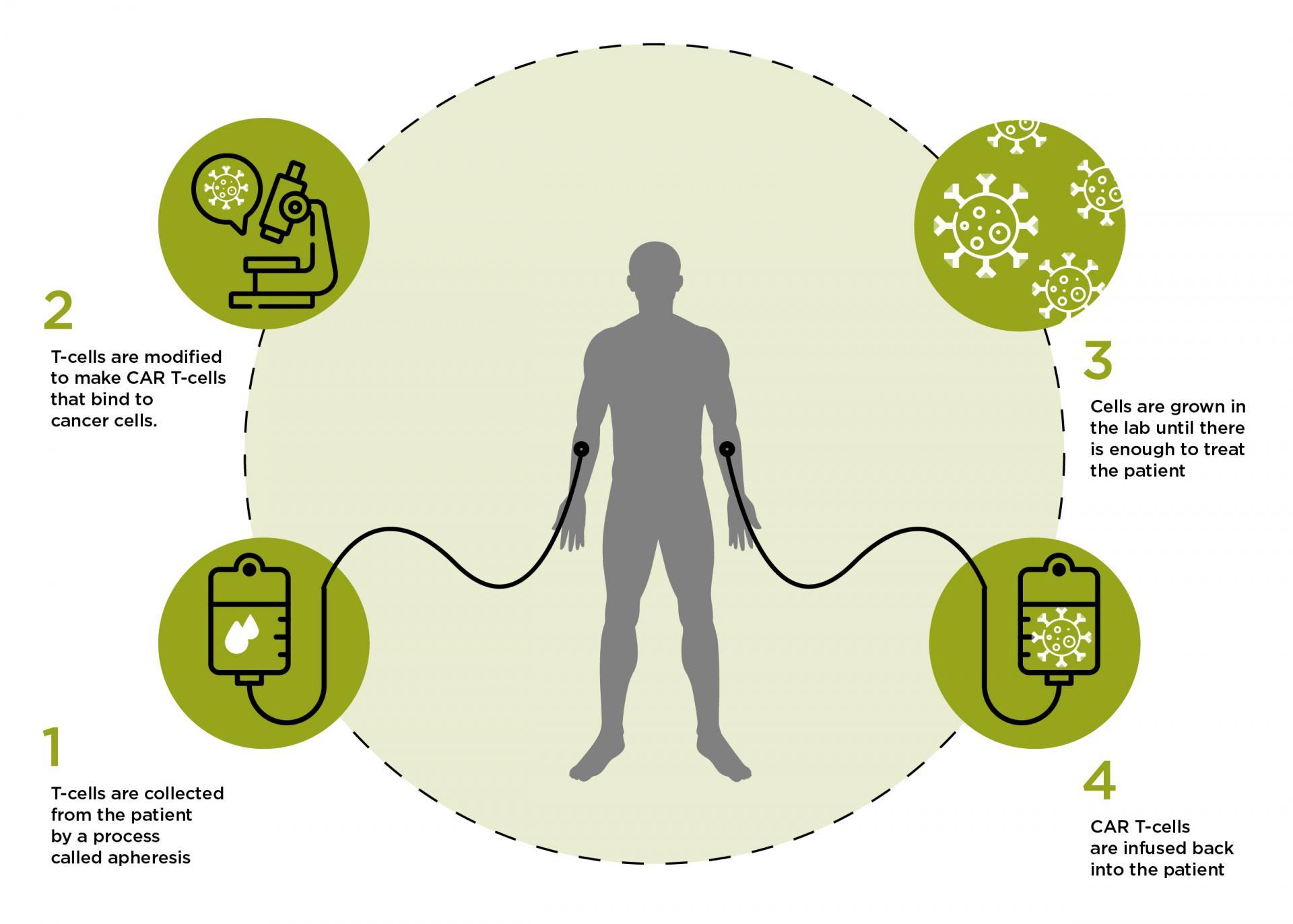 T-cells are an important part of our immune system. They recognise abnormal cells, such as cancerous cells, and destroy them. They do this through receptors on their surface that bind to proteins found on cancerous cells but not on normal cells. When T-cells are collected from the blood, scientists can manipulate their DNA so that they make new proteins, including new types of receptors. These receptors are known as Chimeric Antigen Receptors (CAR), which means the T-cells become CAR T-Cells.