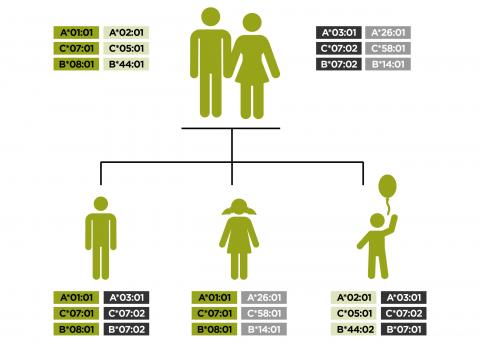 Our HLA genes are all located close to each other on chromosome six, which means they are inherited together as blocks or combinations known as haplotypes from our parents. We inherit one set from our mother and one from our father. This is why brothers or sisters are tested first because they have the best chance of being a perfect match.